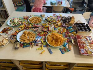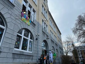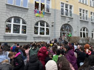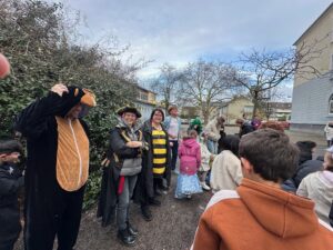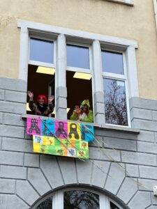 Dort wartete schon die nächste Überraschung: Aus einem Fenster wurden Süßigkeiten in die Menge geworfen! Mit viel Begeisterung sammelten die Kinder die Leckereien ein. Die Freude war riesig, und überall sah man strahlende Gesichter. Es war ein rundum gelungener Karnevalstag voller Musik, Tanz, Lachen und Gemeinschaft.