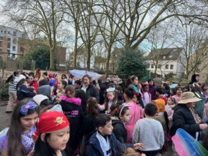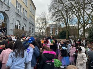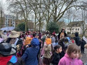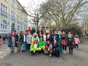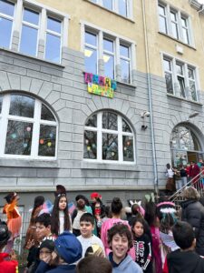 An unserer Grundschule wurde es bunt, fröhlich und richtig laut – wir haben Karneval gefeiert! Schon am Morgen kamen alle Kinder und Lehrkräfte in tollen und kreativen Kostümen zur Schule. Es gab Prinzessinnen, Superhelden, Tiere, Zauberer, Sportlerinnen und viele weitere fantasievolle Verkleidungen zu bestaunen. Die Vielfalt war beeindruckend und überall hörte man fröhliches Lachen. In den Klassenräumen wurde zunächst gemeinsam gefeiert. Es wurde getanzt, gespielt und gesungen. Die Stimmung war ausgelassen und fröhlich, und alle hatten sichtlich Spaß. Ein besonderes Highlight war unsere große Polonäse durch das Schulgebäude. Mit einer langen, fröhlichen Schlange zogen wir durch die Flure. Von Klasse zu Klasse wurden es immer mehr Kinder, die sich anschlossen. Die Polonäse führte schließlich hinaus auf den Schulhof.