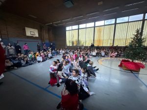 Heute ist der 6.12.2024 und der Nikolaus hat uns besucht. Alle Klassen waren in der Turnhalle, die weihnachtlich dekoriert war. Gemeinsam