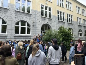 Wie jedes Jahr verabschieden wir unsere Kinder der vierten Klassen mit allen Schülerinnen und Schüler auf dem Schulhof. Durch einen Spalier und unter tosendem Applaus werden die Vierer aus der Schule zum Schulhof geleitet. Dort werden sie von Frau Nagel und allen anderen Lehrerinnen und Lehrern in Empfang genommen. Es findet eine Ehrung der Kinder statt, die an Wettbewerben teilgenommen haben und zusammen werden noch Lieder gesungen. Dann ist es Zeit für uns den Viertklässlerinnen und Viertklässlern „Tschüss“ zu sagen.